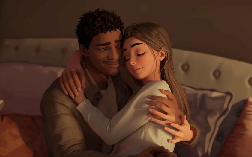 - Romantisch: Zärtliche Umarmungen, sanfte Blicke, Paar-Szenen.
